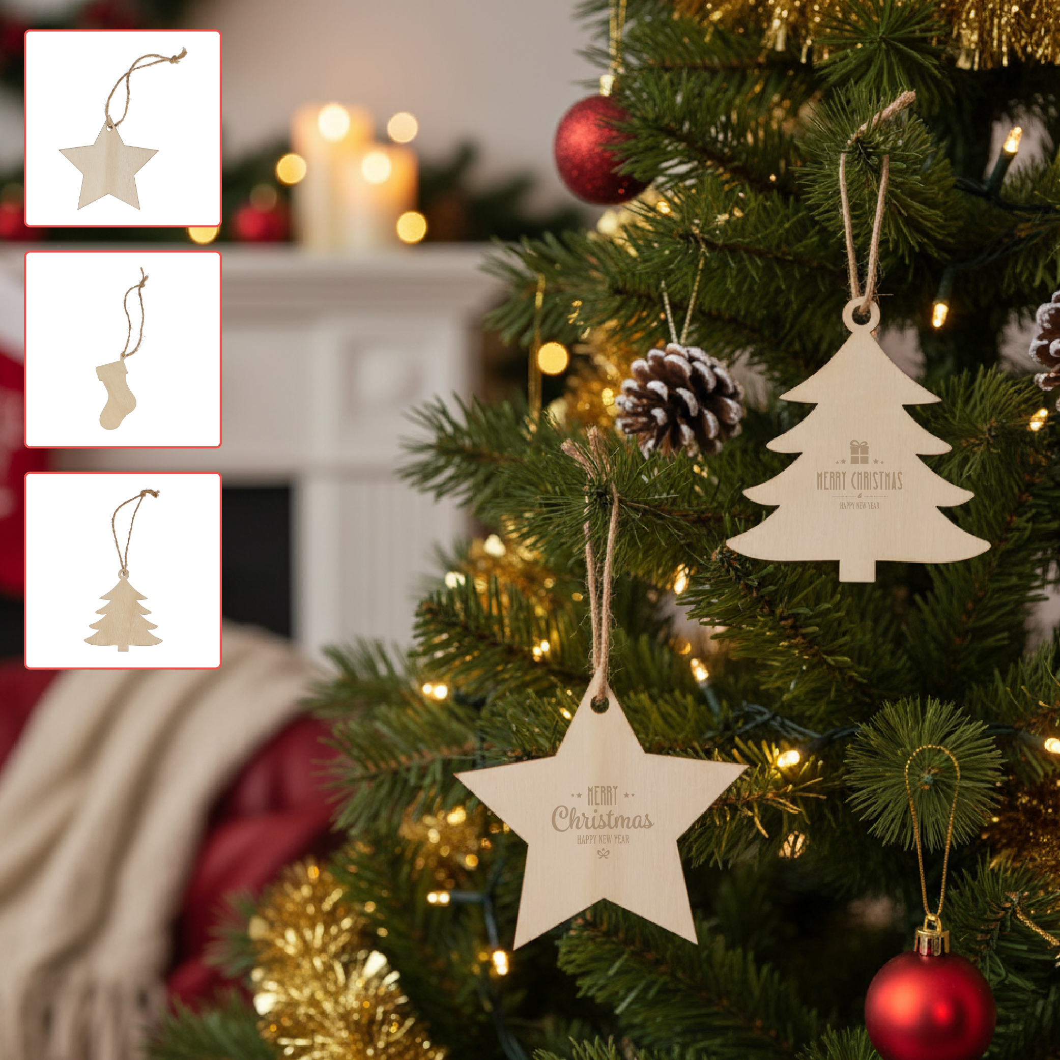 Geef je kerstdecoratie een unieke, persoonlijke touch. Bestel nu en hang dit jaar jouw eigen, gepersonaliseerde houten ornamenten in de boom! Deze kerstornamenten zijn verkrijgbaar in 3 vormen en kunnen gepersonaliseerd worden met jouw logo en/of tekst in full colour of gravering.