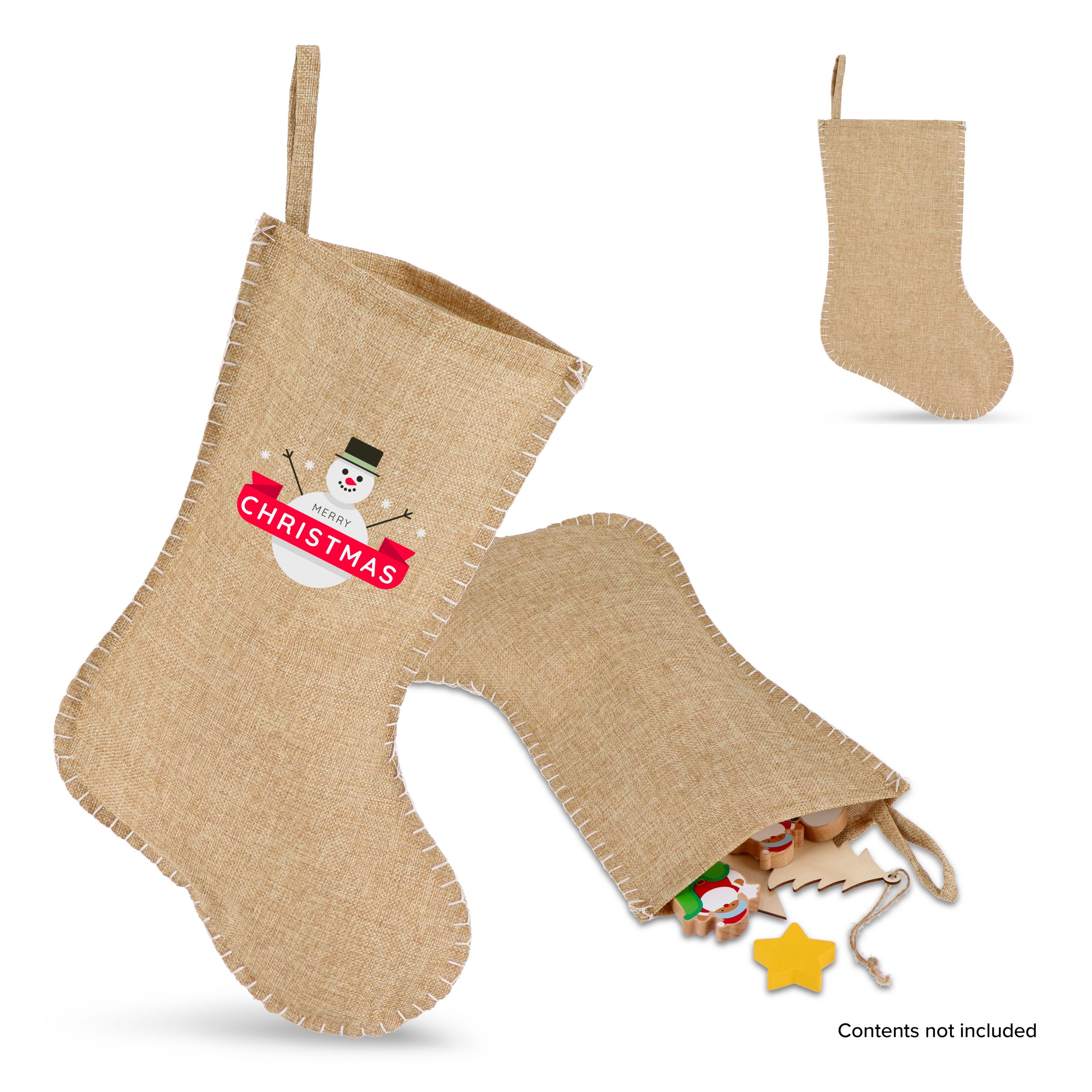 Maak je kerst compleet met deze kerstsok in jute-stijl. De perfecte basis om te personaliseren! Door de kerst sok te bedrukken met een naam of initialen of een logo , creëer je een unieke en blijvende herinnering. Het decoratieve stiksel zorgt voor een sfeervol, handgemaakt accent. Bestel nu en hang deze bedrukte kerstsok op als prachtig decorstuk of als een speciale bewaarplek voor cadeaus!