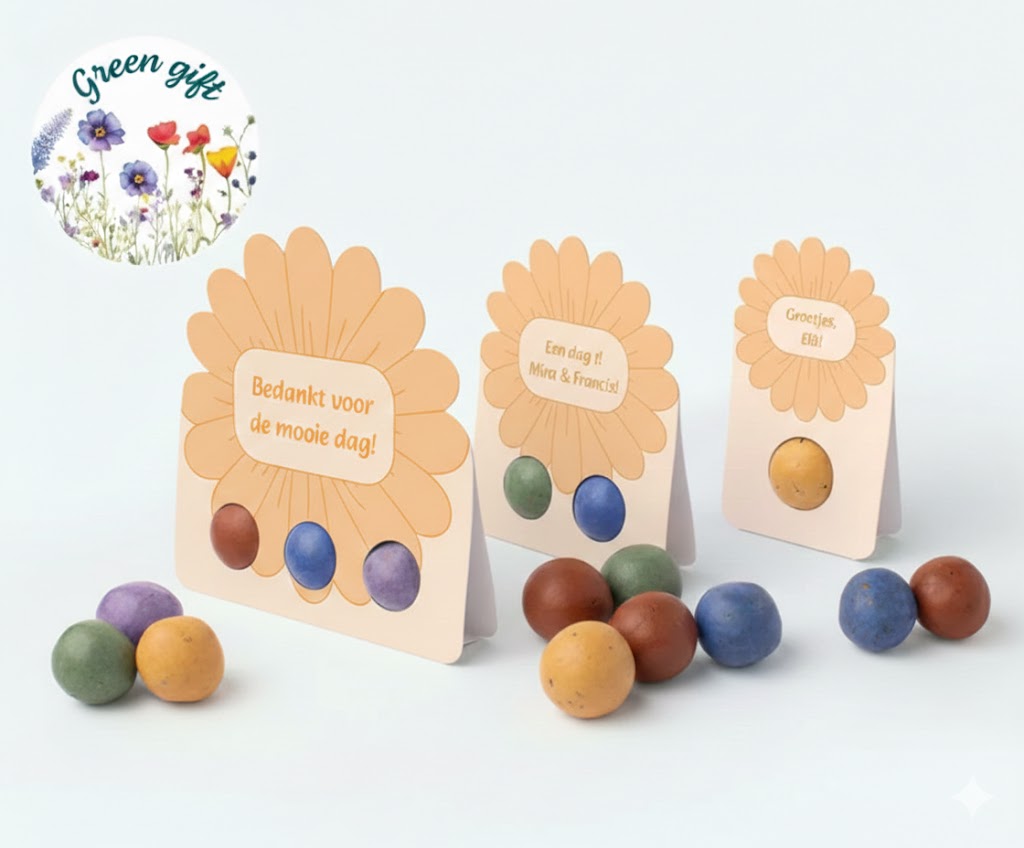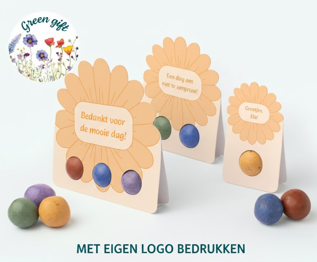 Geef een persoonlijke touch aan uw geschenken en promoties met onze prachtige bedrukte flowerbombs. Deze bloemige geschenken zijn niet alleen een feest voor het oog, maar dragen ook bij aan een groenere planeet. Perfect voor het creëren van een blijvende herinnering aan uw merk, deze flowerbombs zijn een uitstekende keuze voor bedrijven die zich inzetten voor duurzaamheid en natuurbehoud.