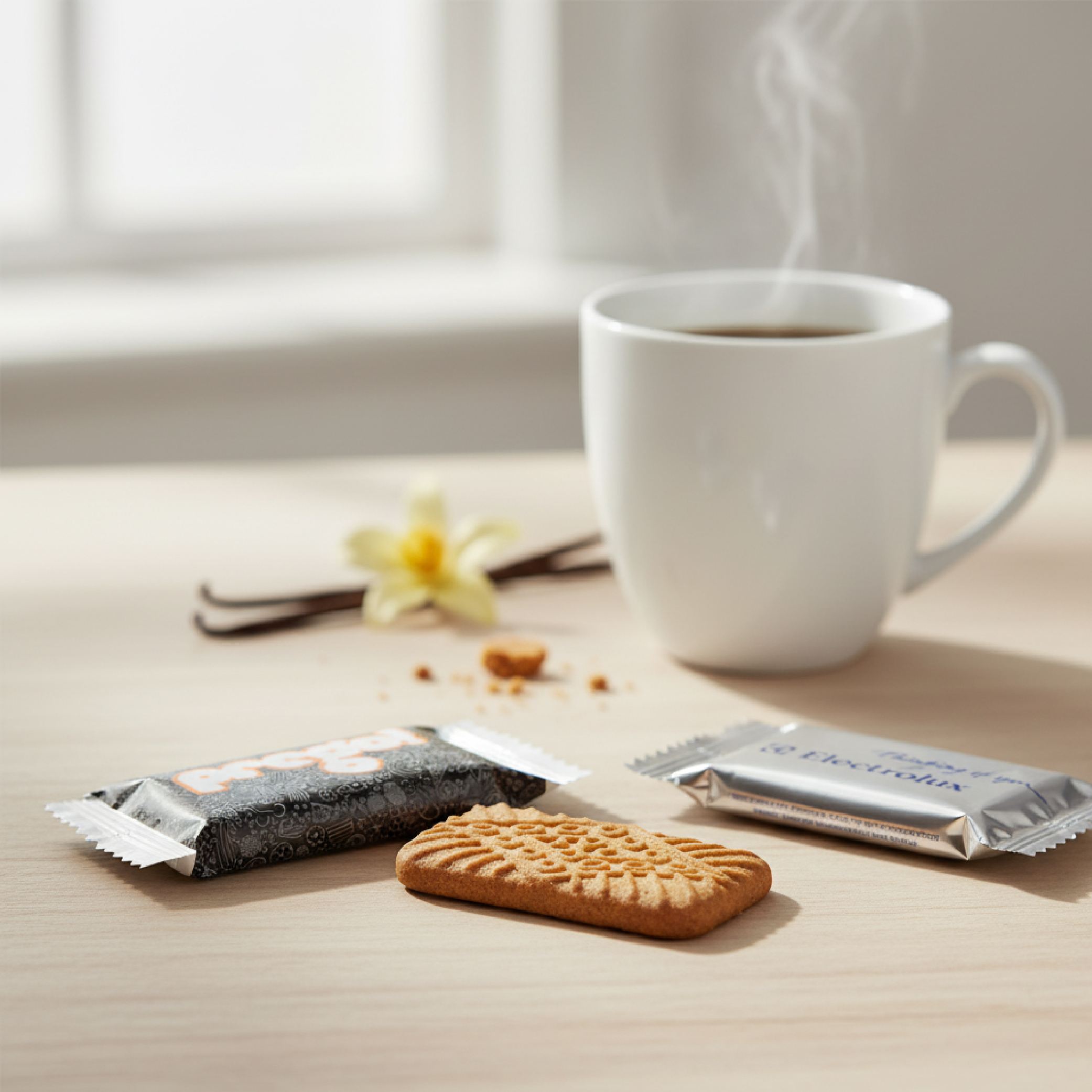 Deze lekkere koffiekoekjes zijn verkrijgbaar vanaf 3000 stuks en het folie is te personaliseren met jouw eigen logo en/of tekst tot maximaal 4 kleuren of volvlaks vanaf 100.000 stuks. Dit koffiekoekjes is het meest populaire horecakoekje en kan worden verpakt in wit, transparant of zilver folie.