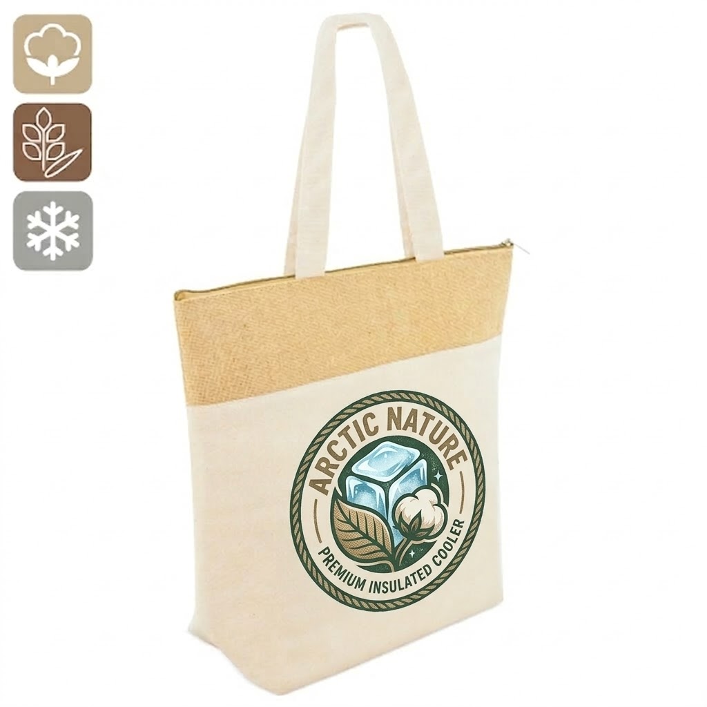 Dé oplossing voor het koel houden van uw eten en drinken tijdens evenementen of reizen. Deze stijlvolle tas, gemaakt van stevig katoen en gelamineerde jute, is niet alleen een uitstekende koeltas, maar ook een praktische boodschappentas!