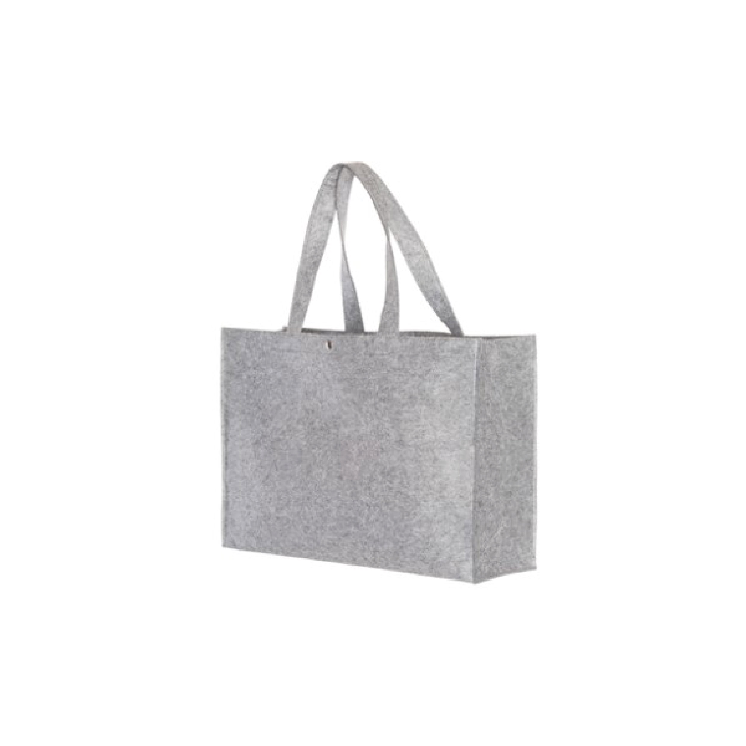 > Deze mooie, stevige en duurzame tas is gemaakt van 220 grams vilt materiaal. De tas is verkrijgbaar in het zwart of grijs, heeft een afmeting van 32 x 23 x 10 cm en kan gepersonaliseerd worden met een eigen logo of tekst. Uw eigen shopper tassen bedrukken kan al vanaf 50 stuks, vraag nu uw offerte aan!